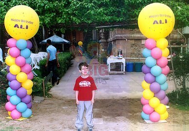 عمود بالون من فوق فى بلونه كبيره عليها اسم صاحب عيد الميلاد